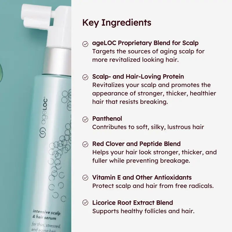 Incredible, rejuvenating hair care to help you look amazing down to your roots. ageLOC Intensive Scalp & Hair Serum delivers vital proteins and nutrients to your scalp and strengthens your roots for a fuller hairstyle. This leave-in, non-greasy formula invigorates the scalp day after day and makes hair look and feel divine. Repeat this effortless ritual morning and night to help revitalize your hair.
