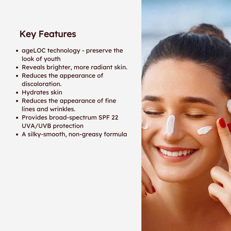 Formulated with broad-spectrum SPF 22, it protects against sun damage and early signs of aging. The non-greasy, fast-absorbing texture wears beautifully under makeup, making it the perfect addition to your morning routine for radiant, all-day confidence.