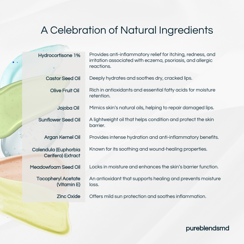 Hydrocortisone 1%, Castor Seed Oil, Olive Fruit Oil, Jojoba Oil, Sunflower Seed Oil, Argan Kernel Oil, Calendula (Euphorbia Cerifera) Extract, Meadowfoam Seed Oil, Tocopheryl Acetate (Vitamin E), Zinc Oxide.