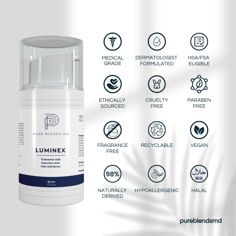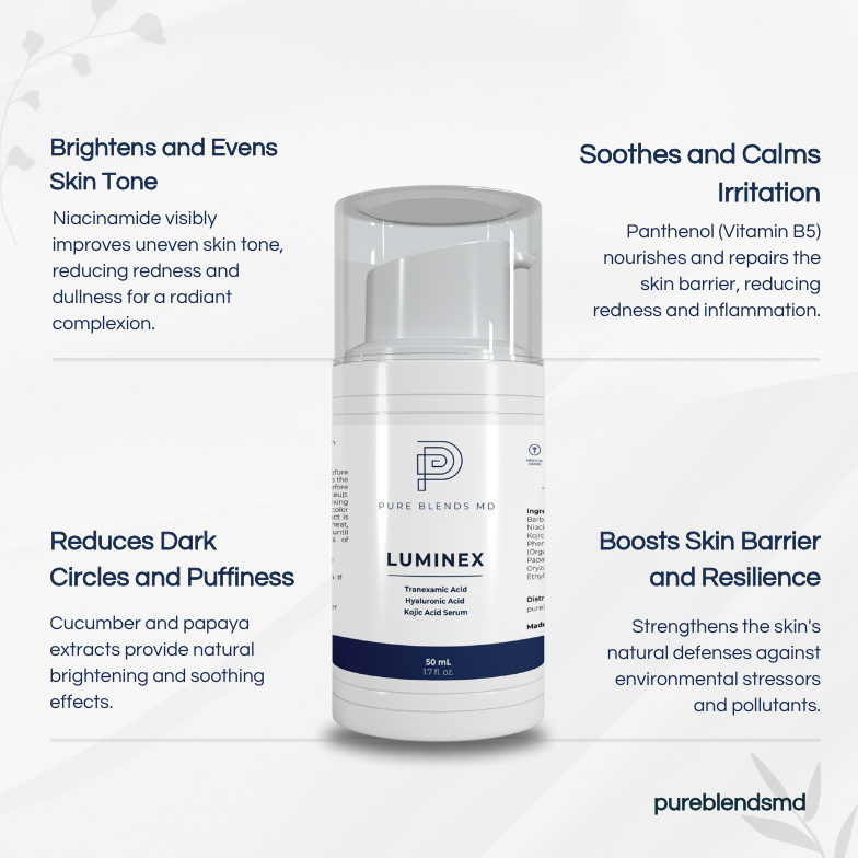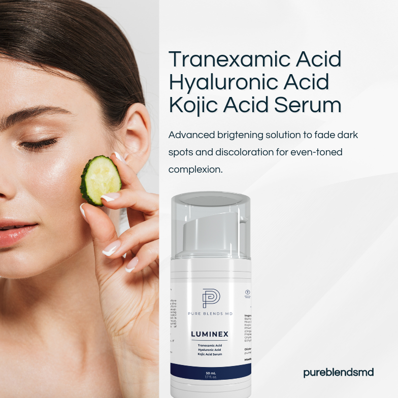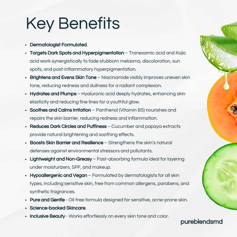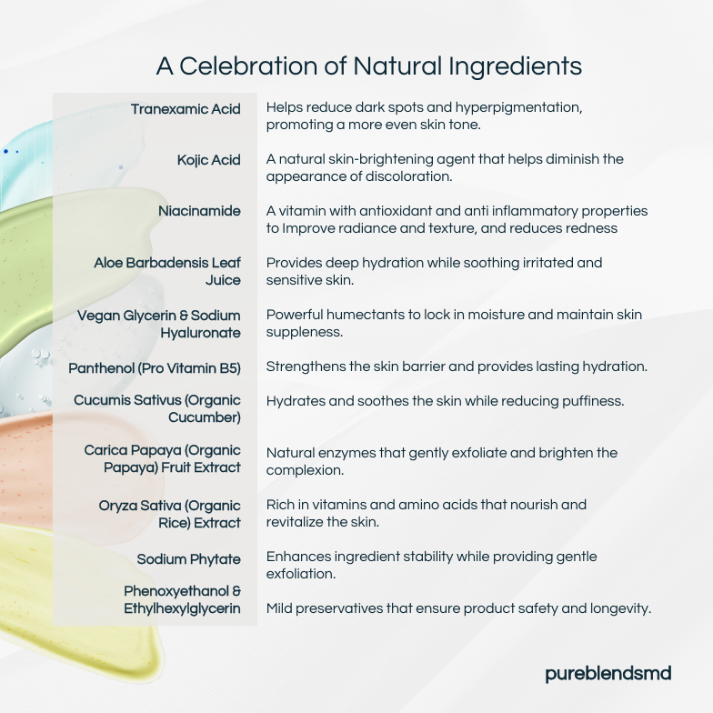 Tranexamic Acid, Kojic Acid, Niacinamide, Aloe Barbadensis Leaf Juice, Vegan Glycerin, Sodium Hyaluronate, Panthenol (Pro Vitamin B5), Cucumis Sativus (Organic Cucumber) Fruit Extract, Carica Papaya (Organic Papaya) Fruit Extract, Oryza Sativa (Organic Rice) Extract, Sodium Phytate, Phenoxyethanol, Ethylhexylglycerin.