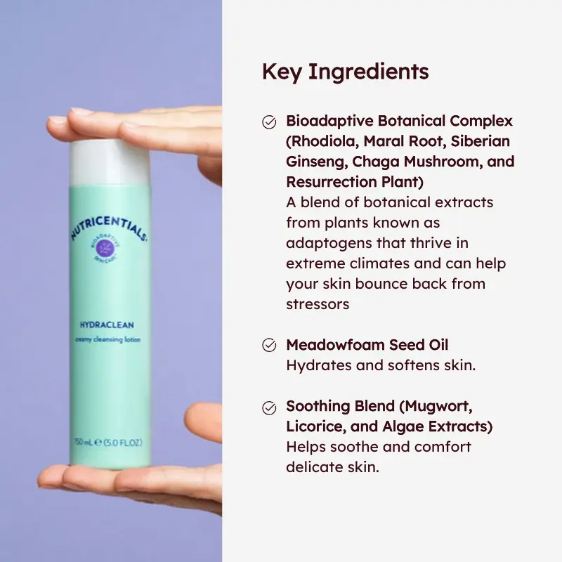 Are cleansers leaving your skin feeling tight and dry? Not anymore! Cleanse, hydrate, and protect your skin with Nutricentials HydraClean. This luxurious, creamy, soap-free cleanser is a gentle multitasker. It cleanses away dirt, excess oil, and makeup—all while protecting your skin’ s natural moisture barrier. Its mild formula is infused with a Soothing Blend and bioadaptive botanicals to help moisturize and comfort skin. The result: your skin is left feeling clean, soft, and comfortably hydrated—and looking vibrant and healthy.