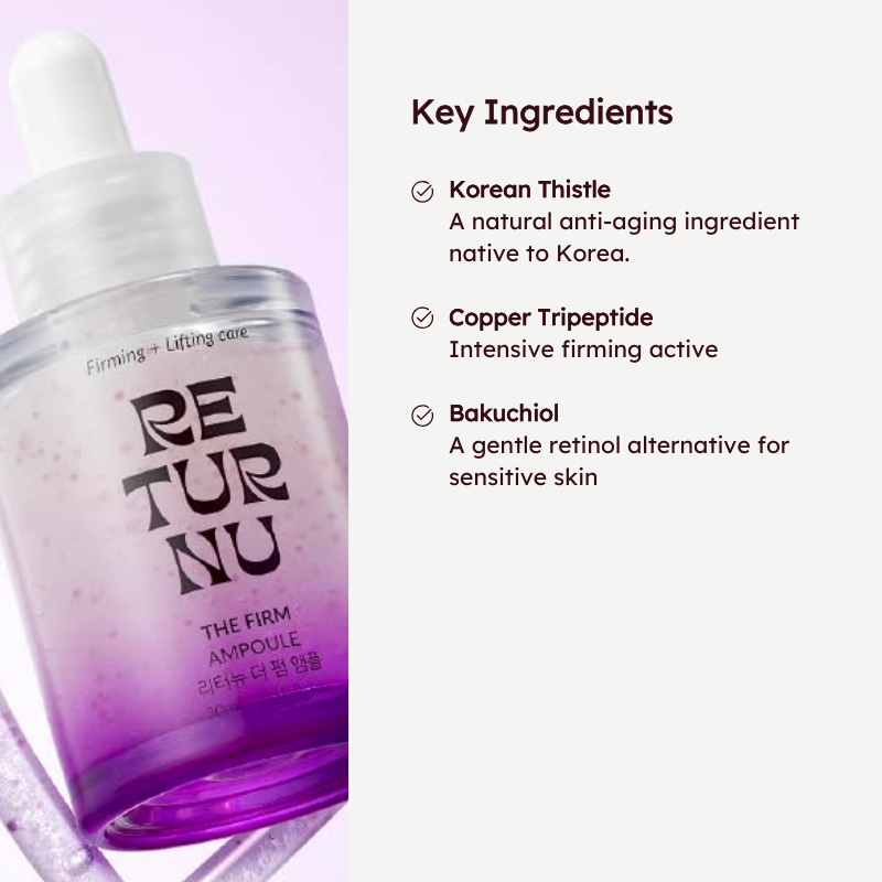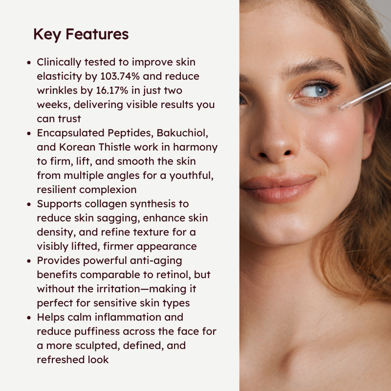 Triple Capsule Technology for Multi-Dimensional Care – Encapsulated Peptides, Bakuchiol, and Korean Thistle work in harmony to firm, lift, and smooth the skin from multiple angles for a youthful, resilient complexion