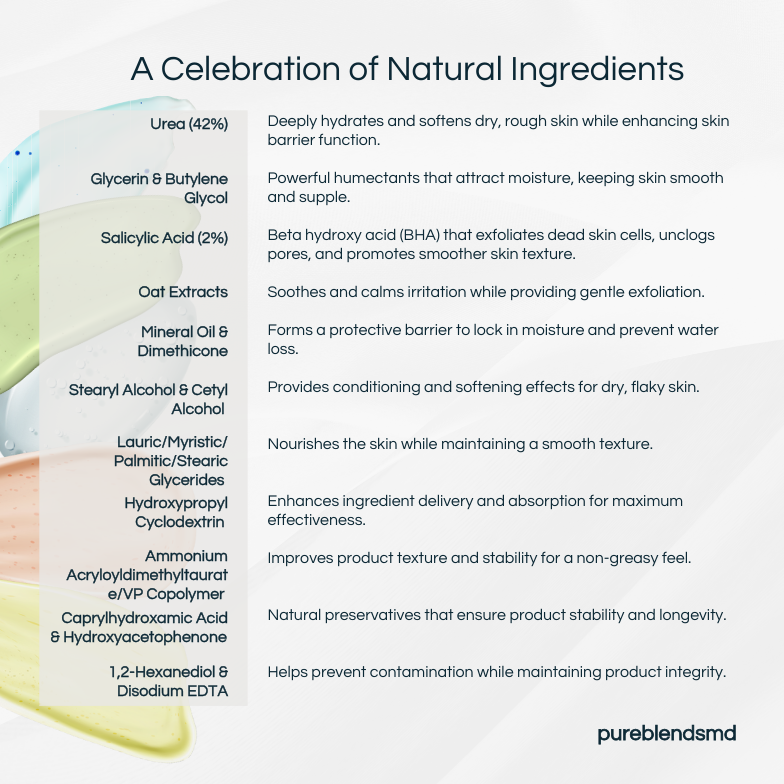 Urea (42%), Glycerin, Butylene Glycol, Salicylic Acid (2%), Oat Extract, Mineral Oil, Dimethicone, Stearyl Alcohol, Cetyl Alcohol, Lauric/Myristic/Palmitic/Stearic Glycerides, Hydroxypropyl Cyclodextrin, Ammonium Acryloyldimethyltaurate/VP Copolymer, Caprylhydroxamic Acid, Hydroxyacetophenone, 1,2-Hexanediol, Disodium EDTA.